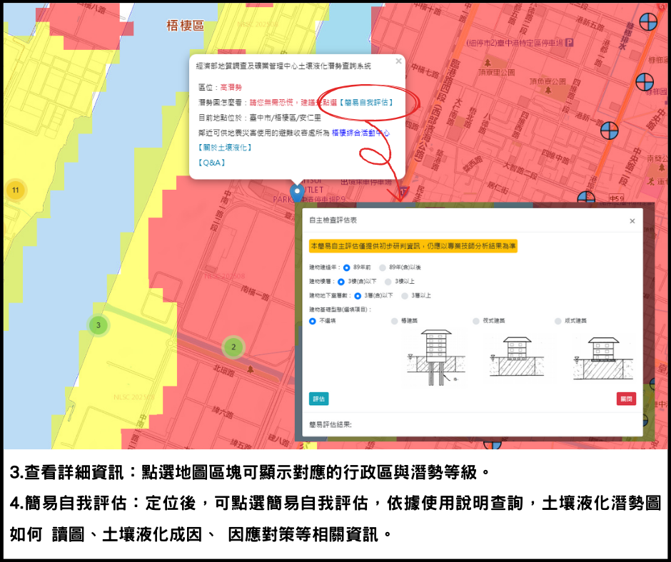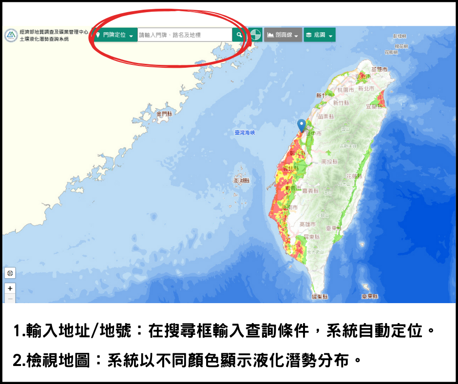 • 地圖查詢:輸入地址或地號,即可定位並顯示液化潛勢情形。