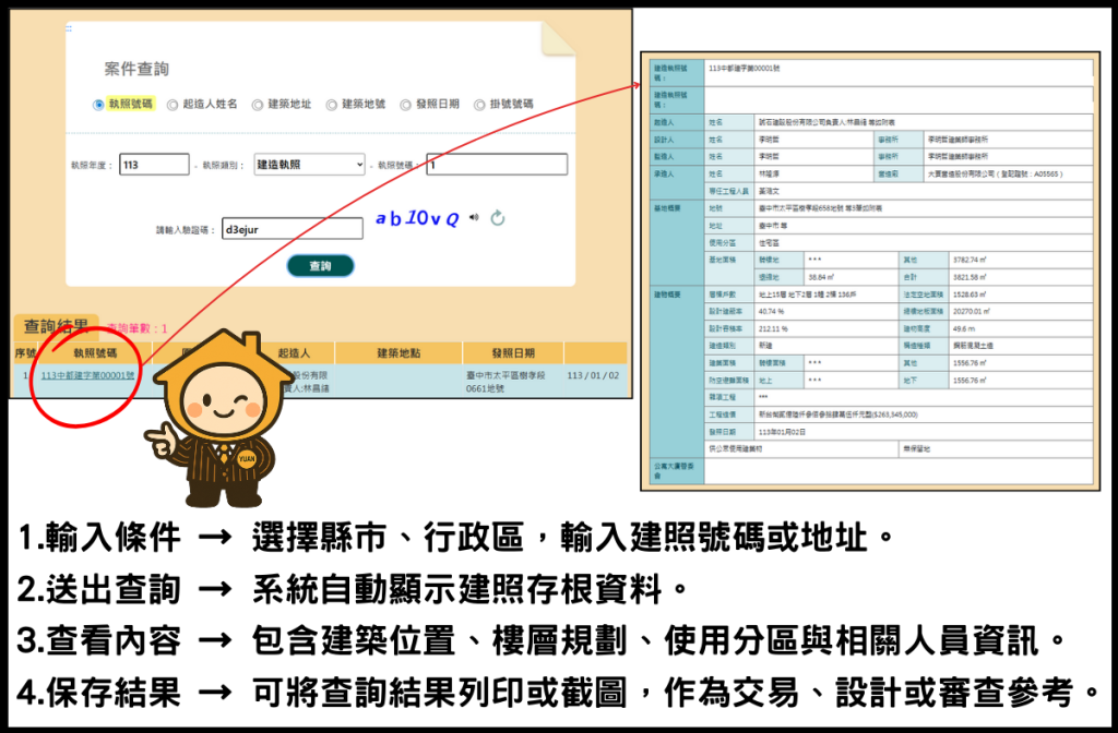 - 建照查詢:可依縣市、行政區、建照號碼或地址查詢。