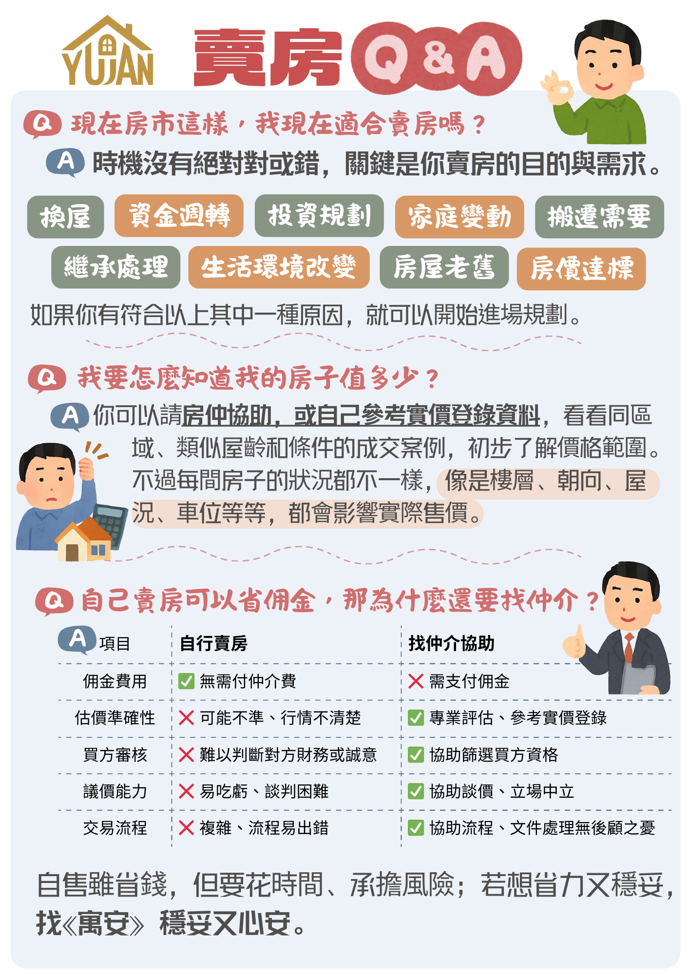 賣房的路上,總會遇到一些疑問與不確定。沒關係,寓安陪您一一釐清,從價格、流程到每個小細節,讓您更有方向,也更安心踏出每一步。