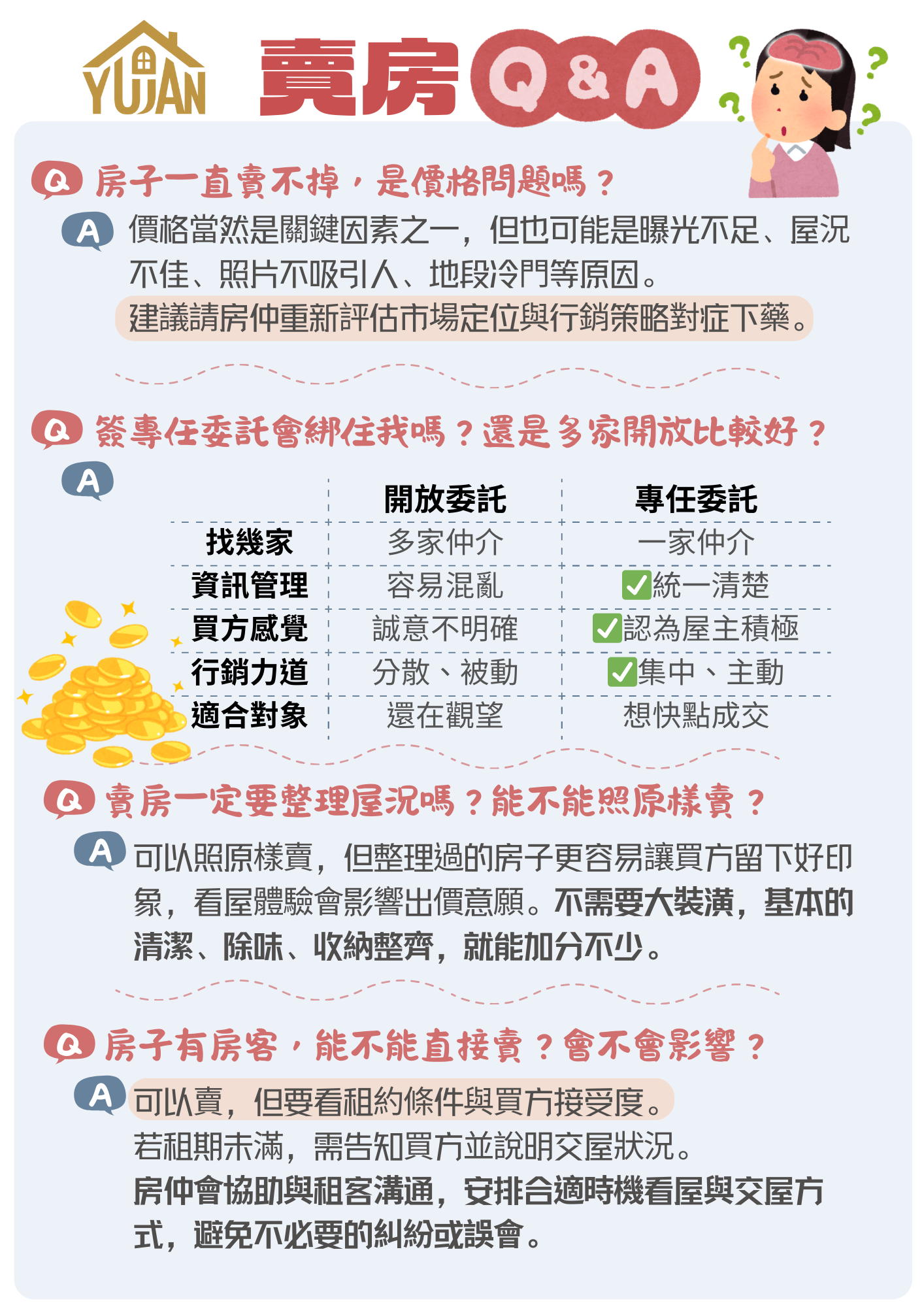 房子賣不掉,是價格問題嗎?開放委託好,還是專任更有效?有租客還能賣嗎? 賣房疑問多,別擔心,寓安幫您一次搞懂!