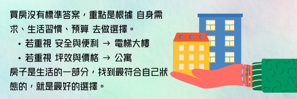 📌 結語: 想「舒適便利」就選大樓,想「經濟實惠」就選公寓。