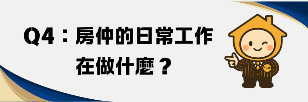 A:房仲的日常很充實,但不死板。核心工作包含三件事: